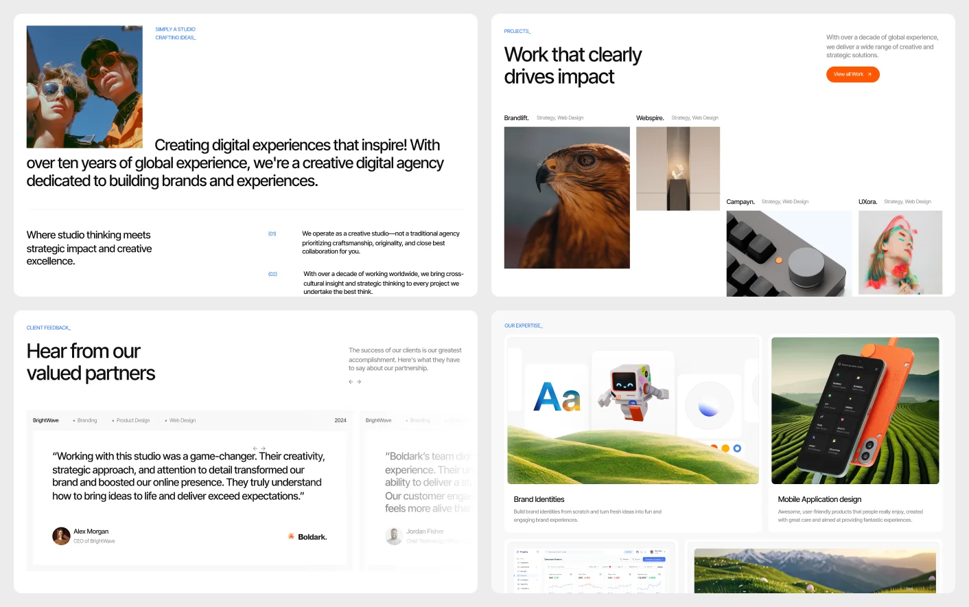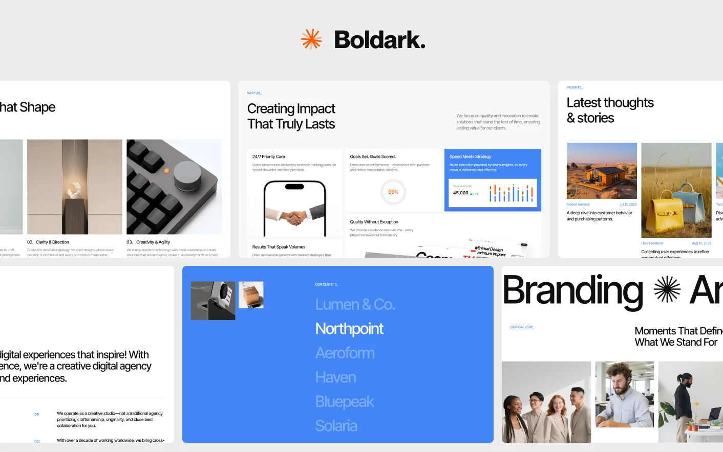 Boldark follows proven agency website structures used by successful creative brands. Its clear layout, smooth animations, and balanced content flow guide visitors naturally from portfolio discovery to inquiry.