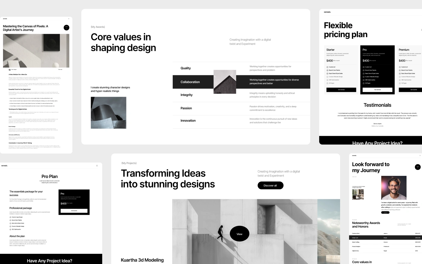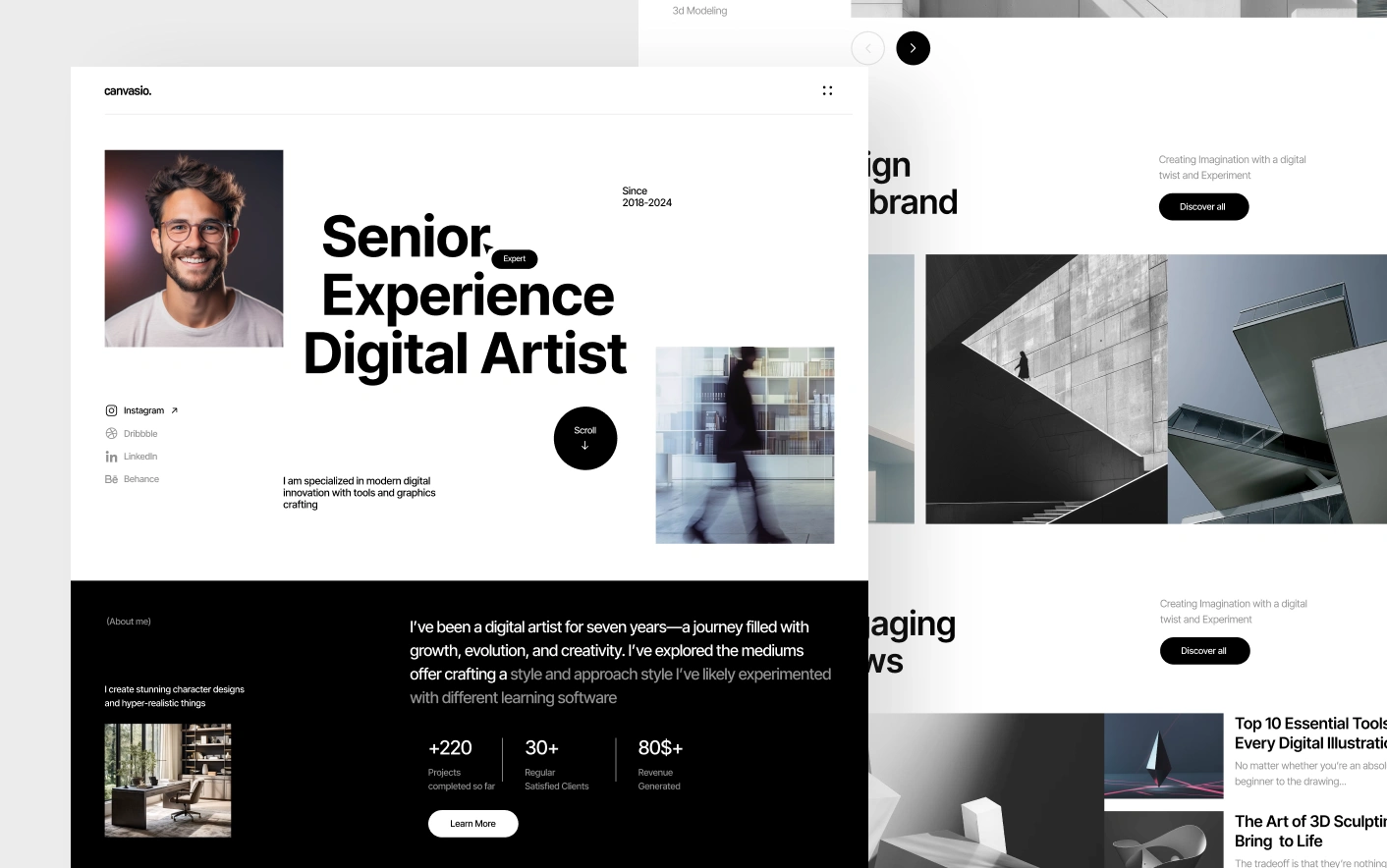 Canvasio is a modern digital artist portfolio template built for creatives who want to present their artwork, services, and projects online. Available for Webflow CMS, it helps artists and studios launch quickly with a clean and structured portfolio design.