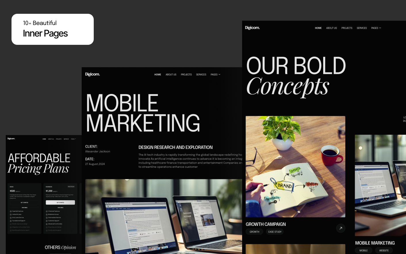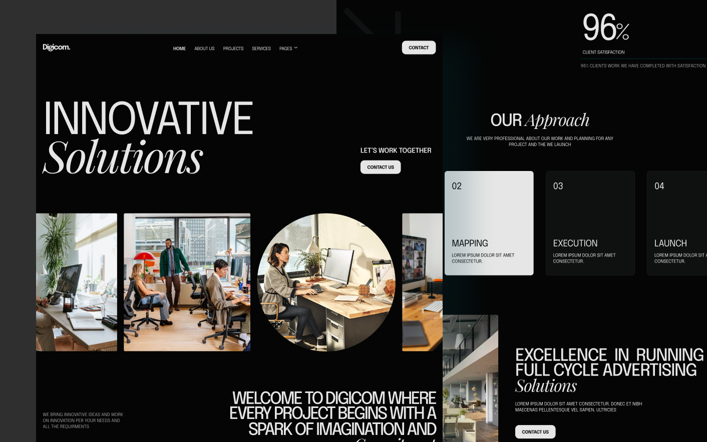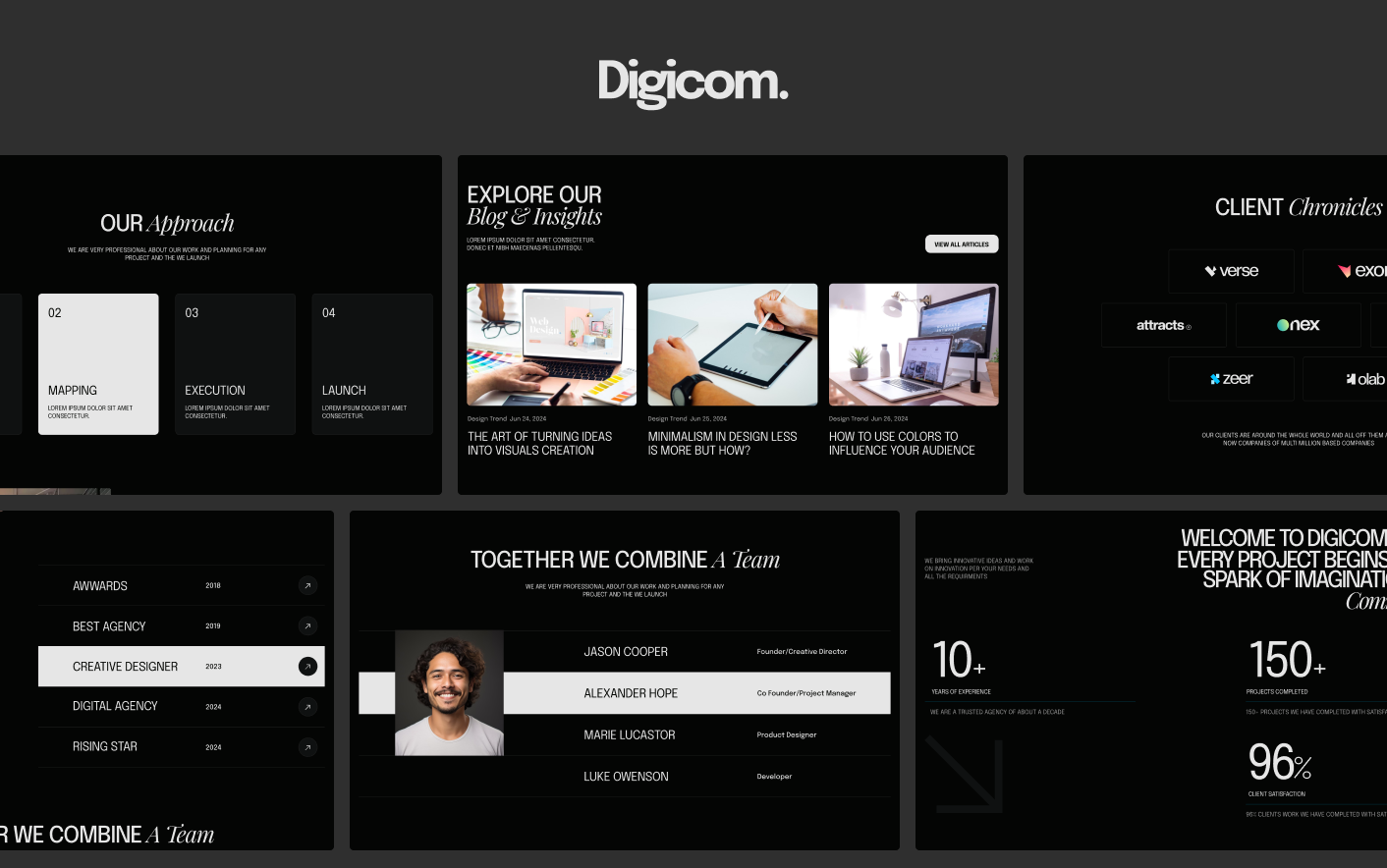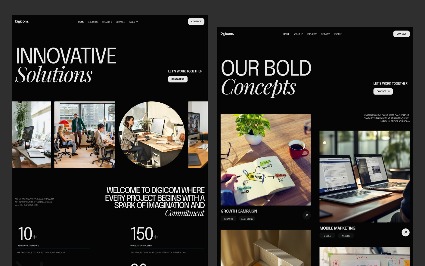 Digicom follows modern website patterns used by successful digital agencies and creative studios. Its dark interface, structured sections, and focused layouts help visitors understand your services quickly while creating a strong visual impression.