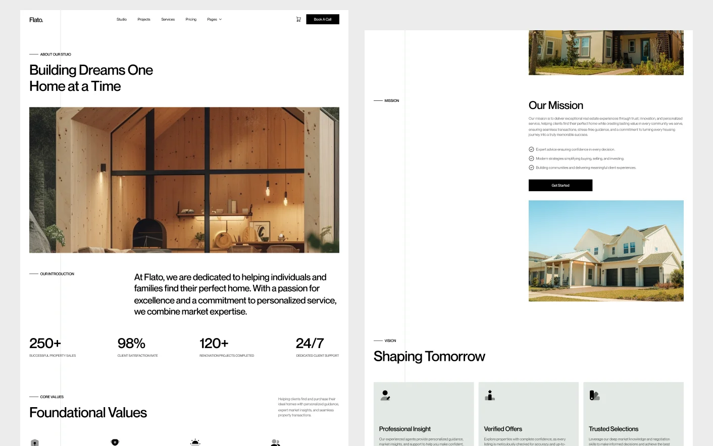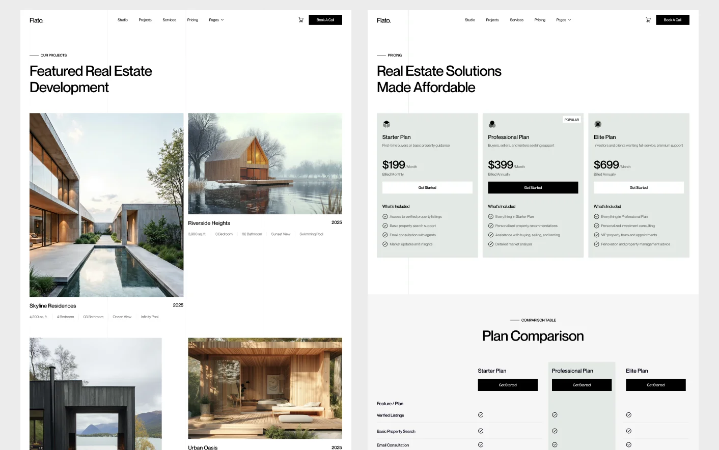 Flato's homepage features an animated hero, services section, custom animated graphics, About, Projects, properties, client feedback, pricing, blog highlights, and FAQs to guide visitors naturally toward your listings. View Homepage