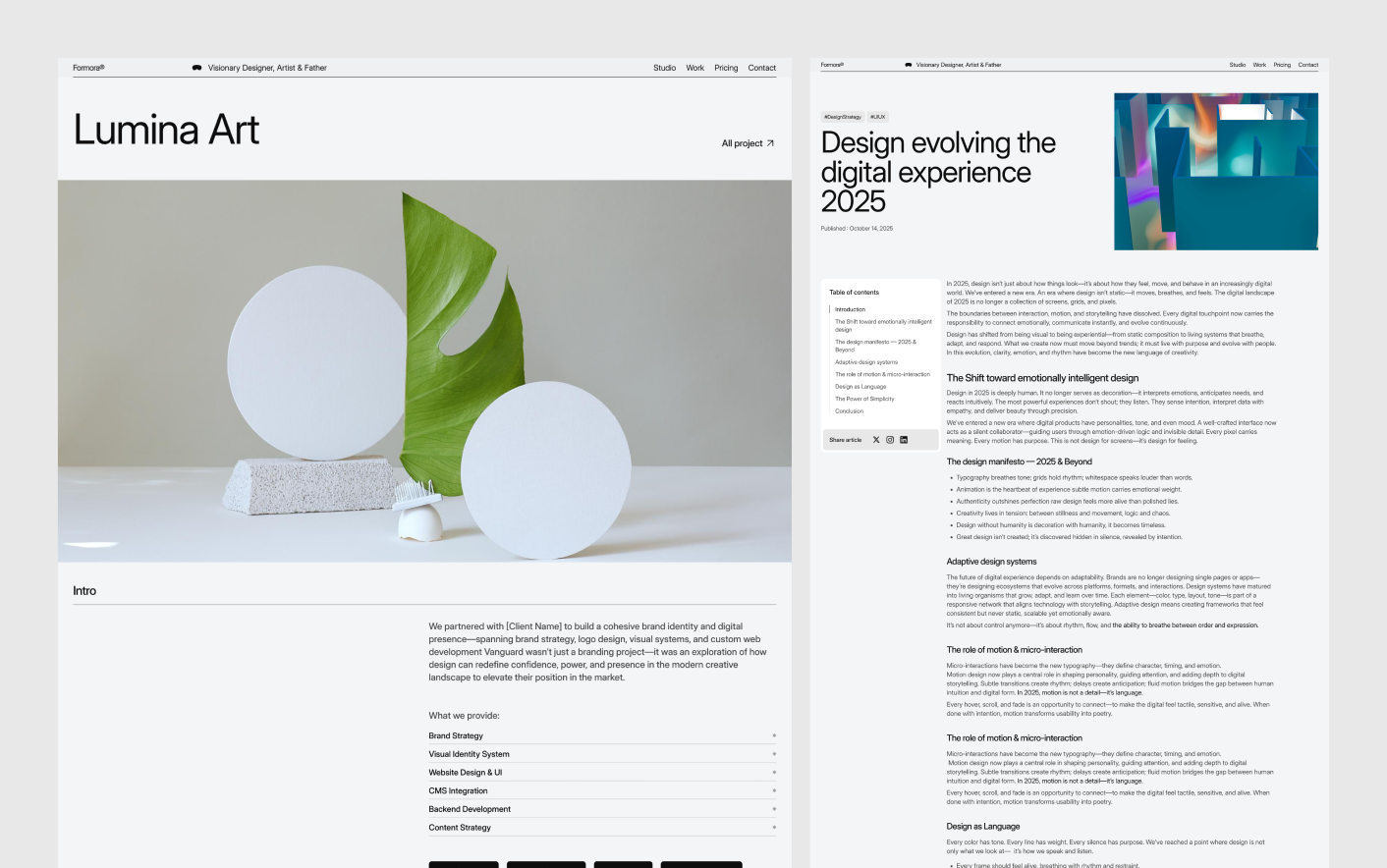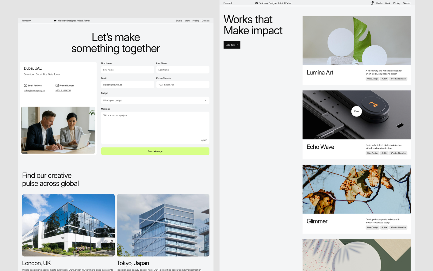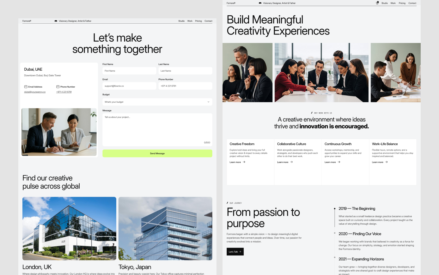 Formora follows proven portfolio design principles used by leading designers and creative studios. Its balanced layout, clear content sections, and thoughtful spacing help visitors focus on your work without distraction.