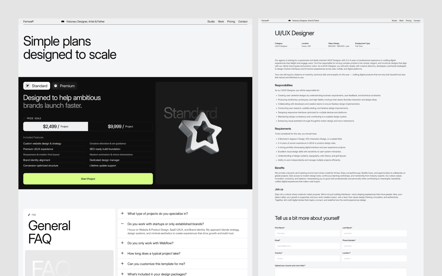 Formora is a modern Webflow portfolio template created for designers, studios, and creative professionals who want to present their work with clarity and confidence. It offers a refined and professional layout that helps you showcase projects, services, and expertise in a structured way.