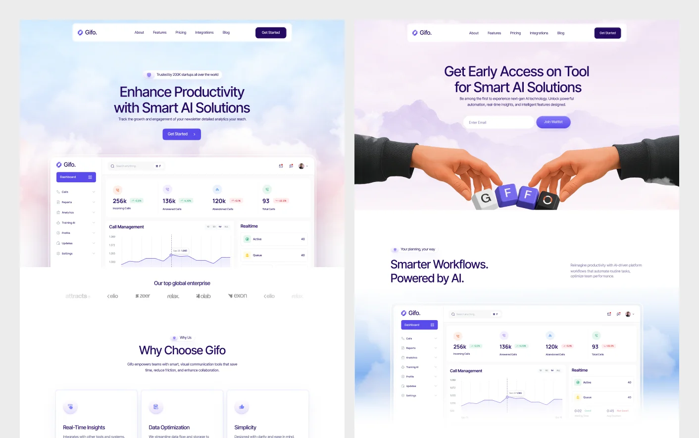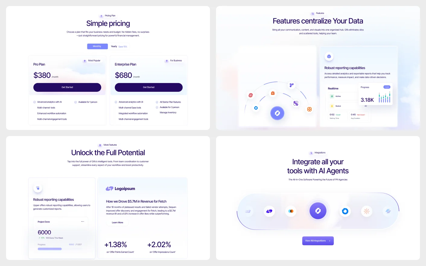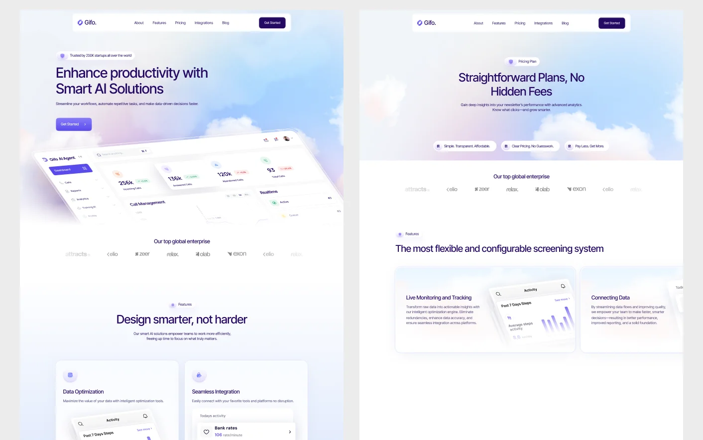 Gifo is designed following best practices from high-performing AI SaaS platforms. Its clean layouts, intentional content flow, and interactive elements guide visitors naturally from discovery to decision. Every section focuses on how technology products are evaluated in real life, helping you communicate value clearly, build credibility, and reduce friction from feature exploration to signup.