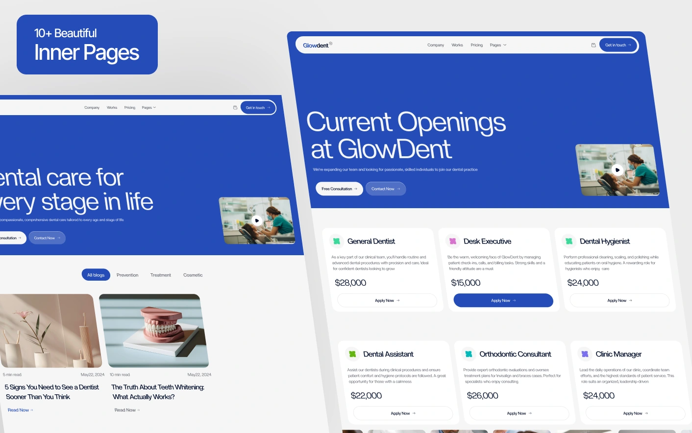 Glowdent also includes essential utility pages such as a 404 Error page and Legal pages, helping ensure your healthcare website runs smoothly with all required supporting pages.