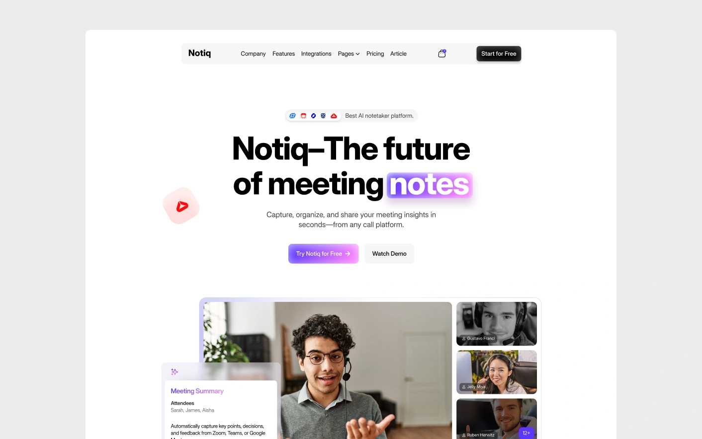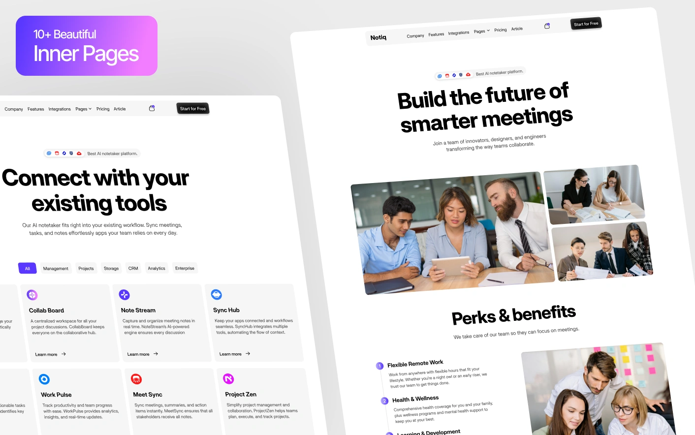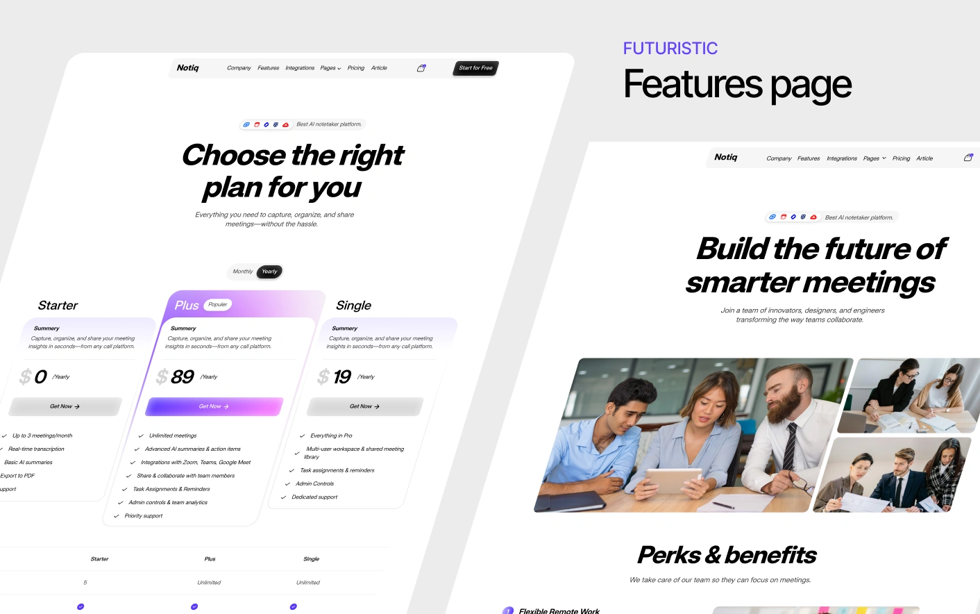 Notiq is an AI SaaS Website Template built for AI meeting notes and productivity tools. It gives startups a clean and professional foundation to present their product clearly and build trust from day one.