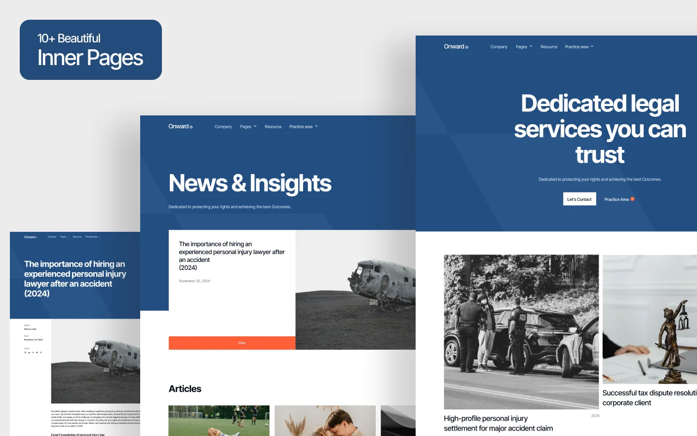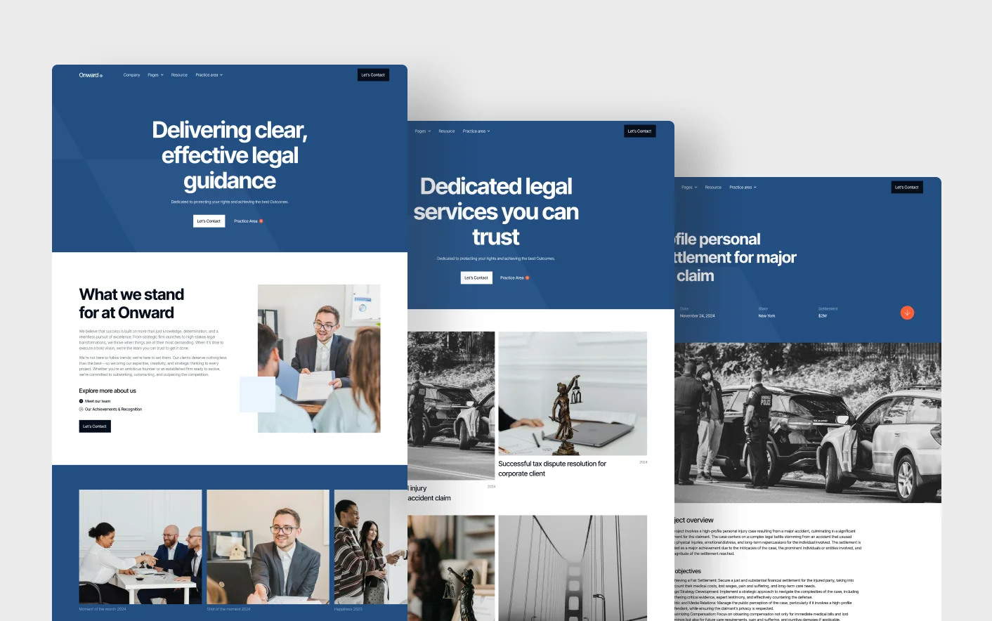 Onward follows proven website structures used by modern legal practices. Its organized layout, clear content hierarchy, and well placed sections help visitors understand your legal services quickly and confidently.