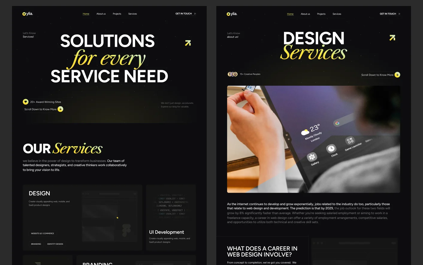 Oylia’s homepage features a strong hero section, agency introduction, services overview, selected work showcase, partner logos, awards, and a clean footer designed to build trust and encourage inquiries. View Homepage