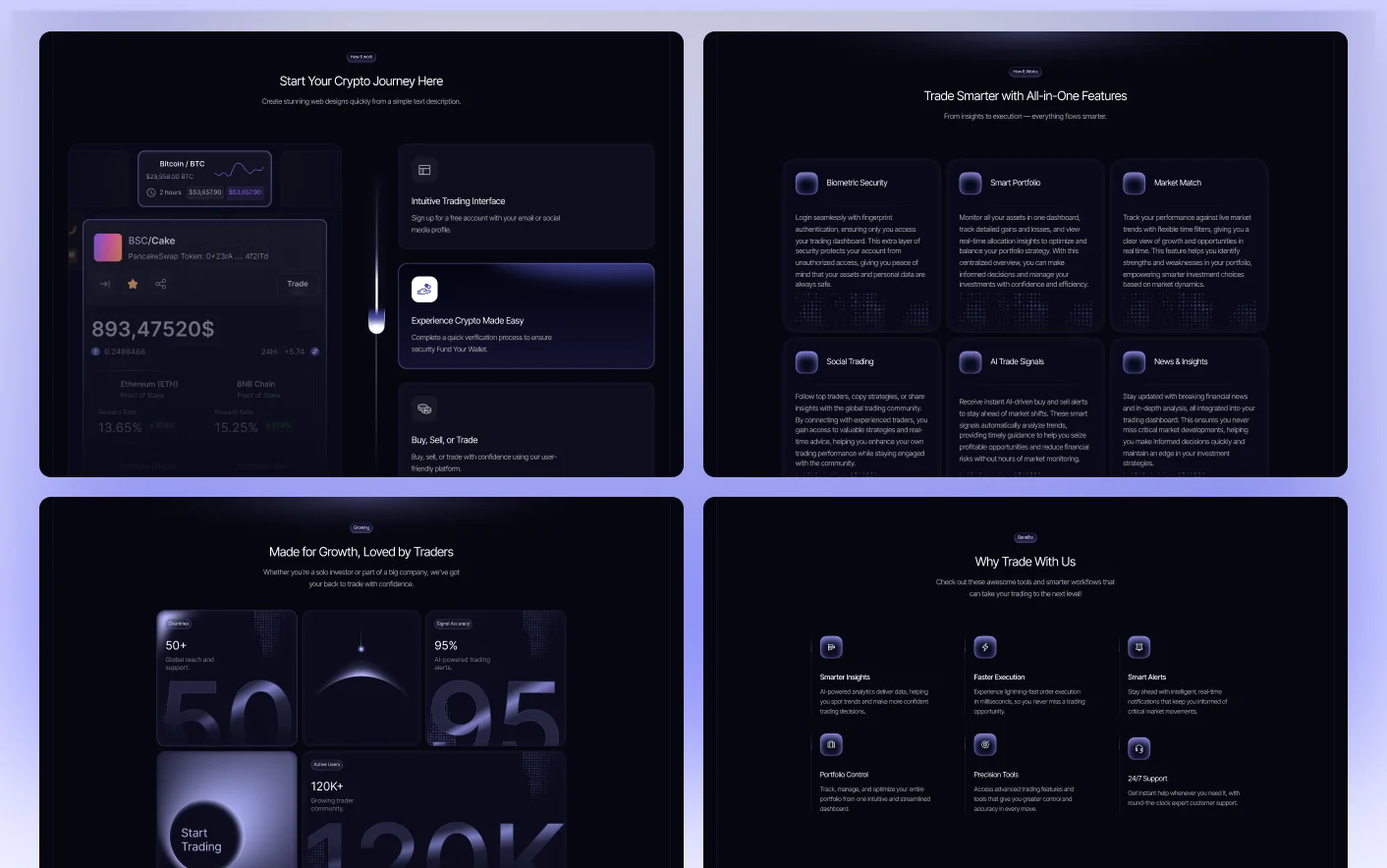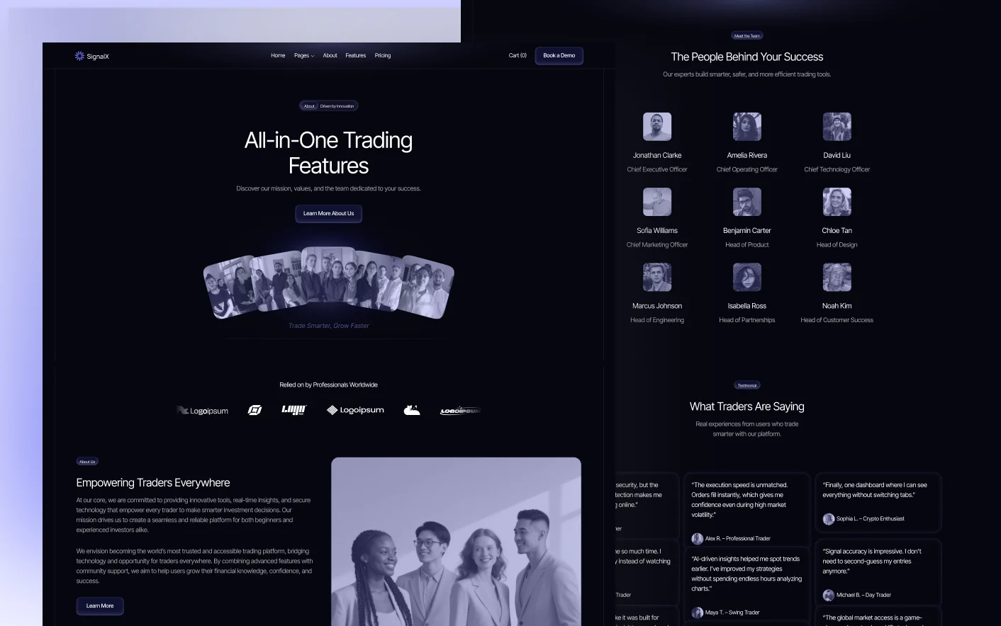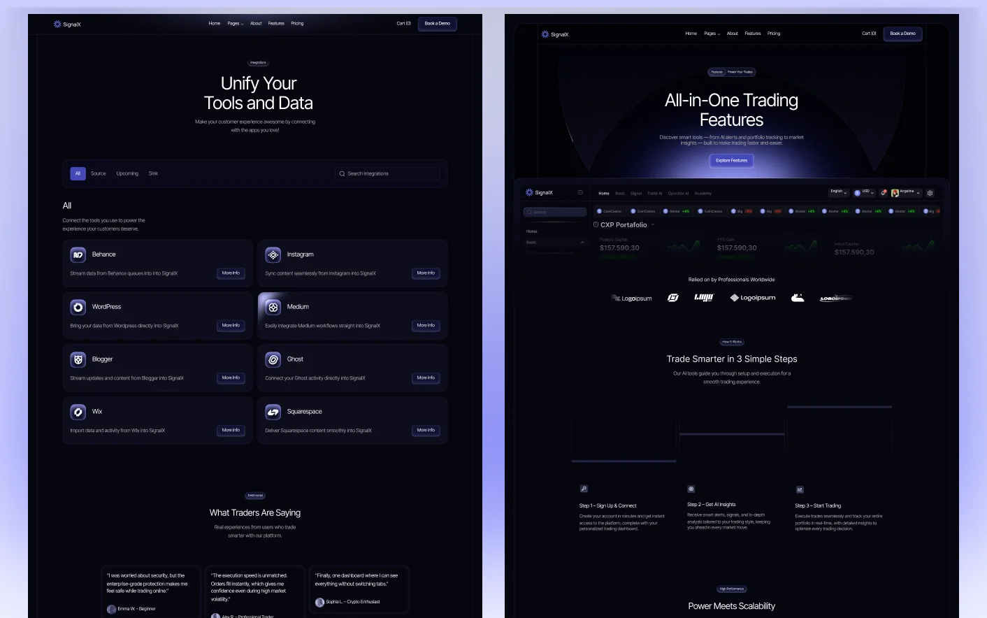 Signal X follows practical SaaS design structures used by high performing AI and finance platforms. Its organized layout and visual flow help users understand product value without confusion.