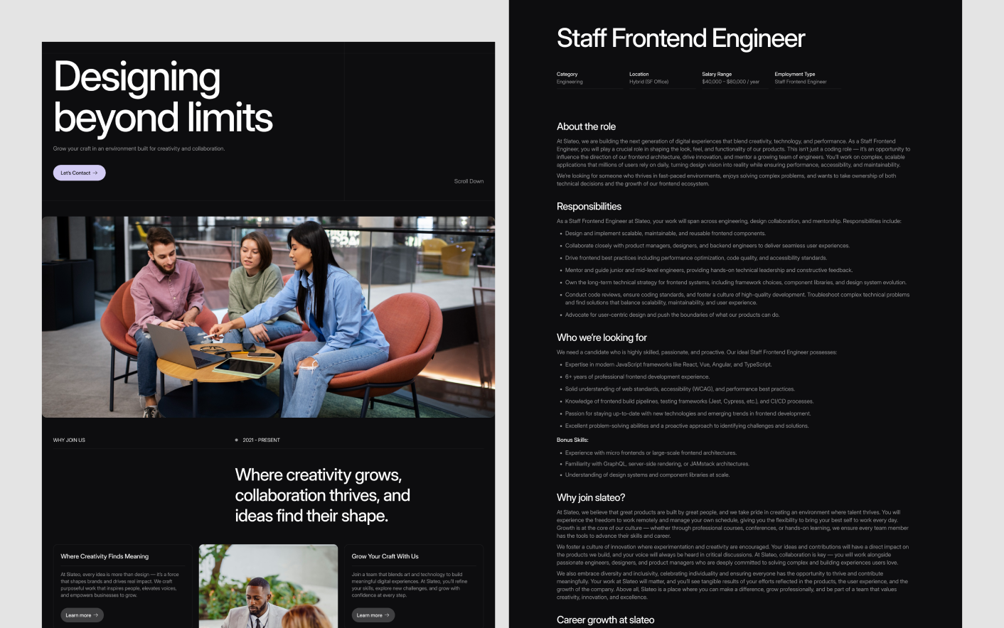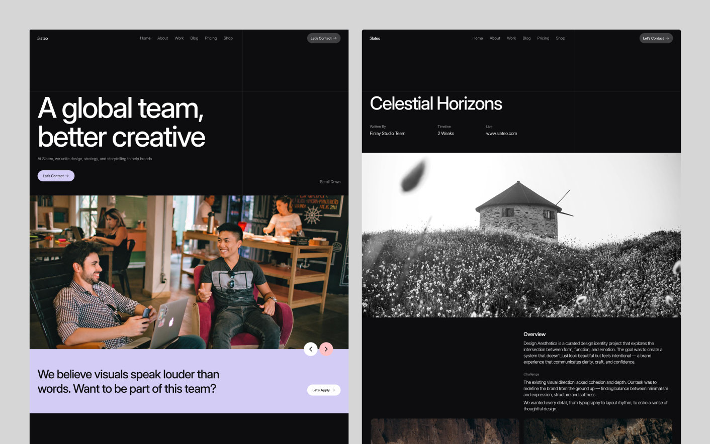 Slateo follows proven agency website structures used by modern creative studios. Its balanced layout, clean spacing, and logical content flow help guide visitors from introduction to inquiry without confusion.