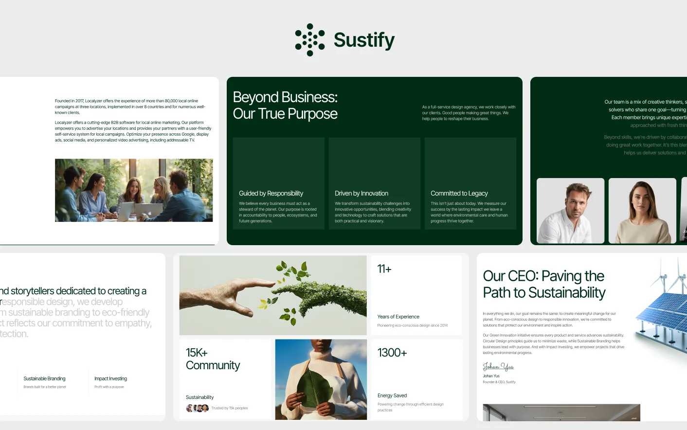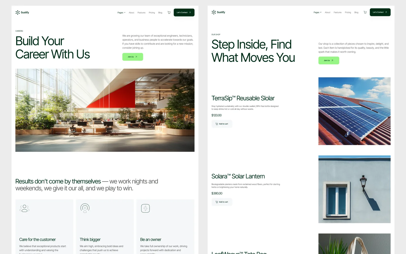 Built to help purpose driven companies launch quickly, Sustify makes it easy to present your values, highlight your solutions, and build credibility with customers who care about sustainability and long term change.