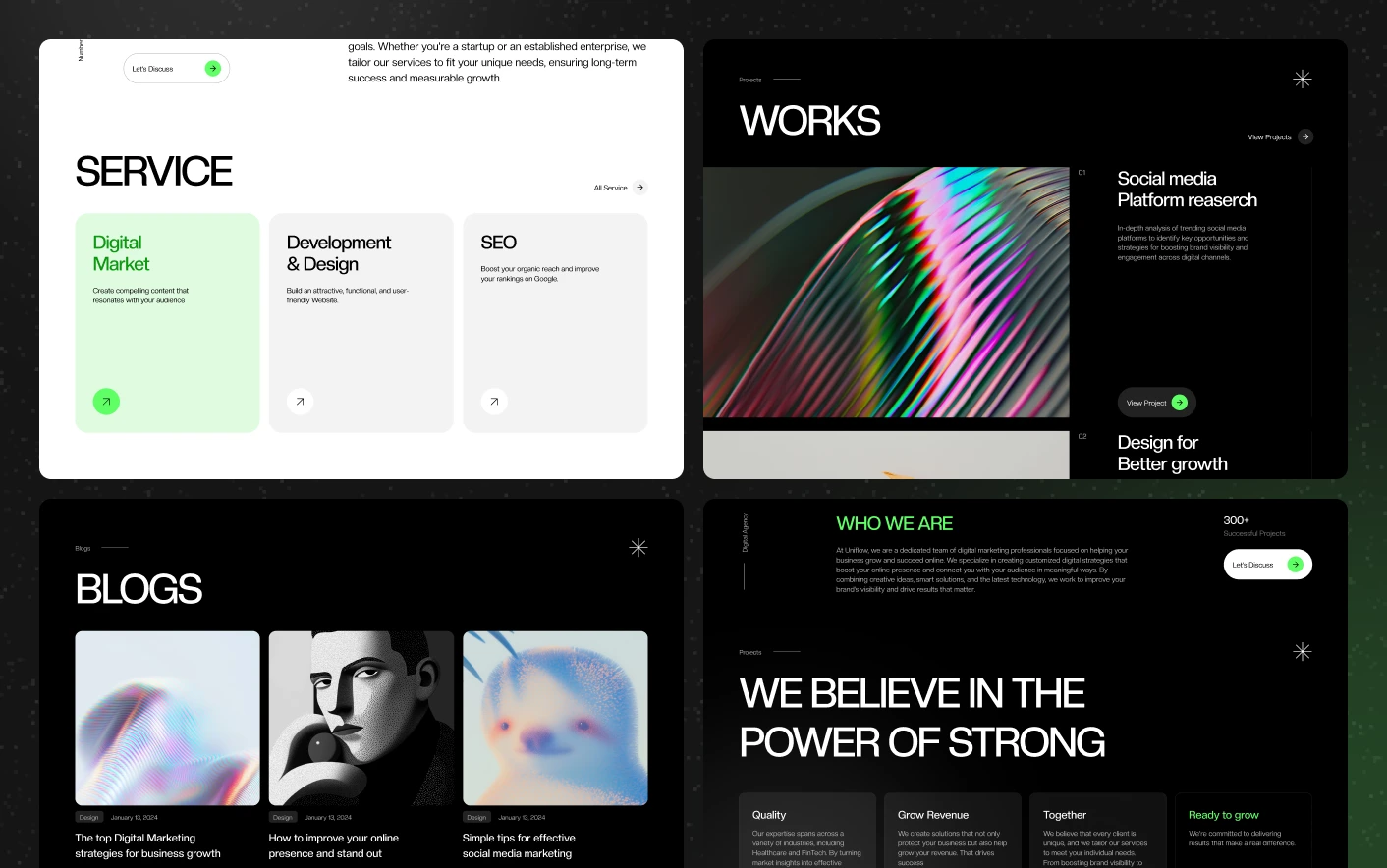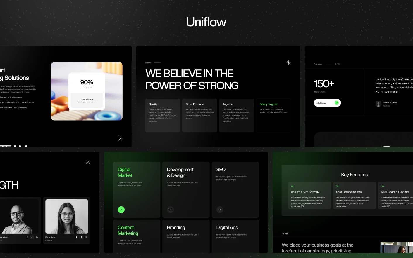 Uniflow follows modern agency website patterns used by successful marketing studios and creative teams. Its dark visual style, animated elements, and structured layouts help present services and projects in a clear and engaging way.