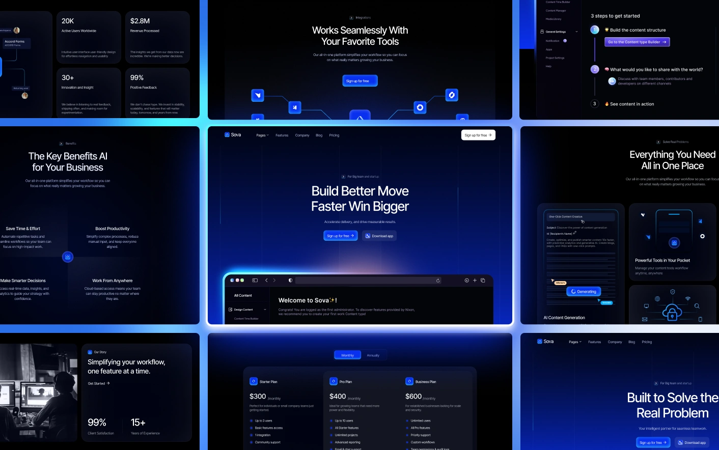 Built with performance and user experience in mind, Sova features a fully responsive layout that looks stunning on all devices. Each page is carefully crafted to guide users toward action – from learning about your product to signing up for a free trial.